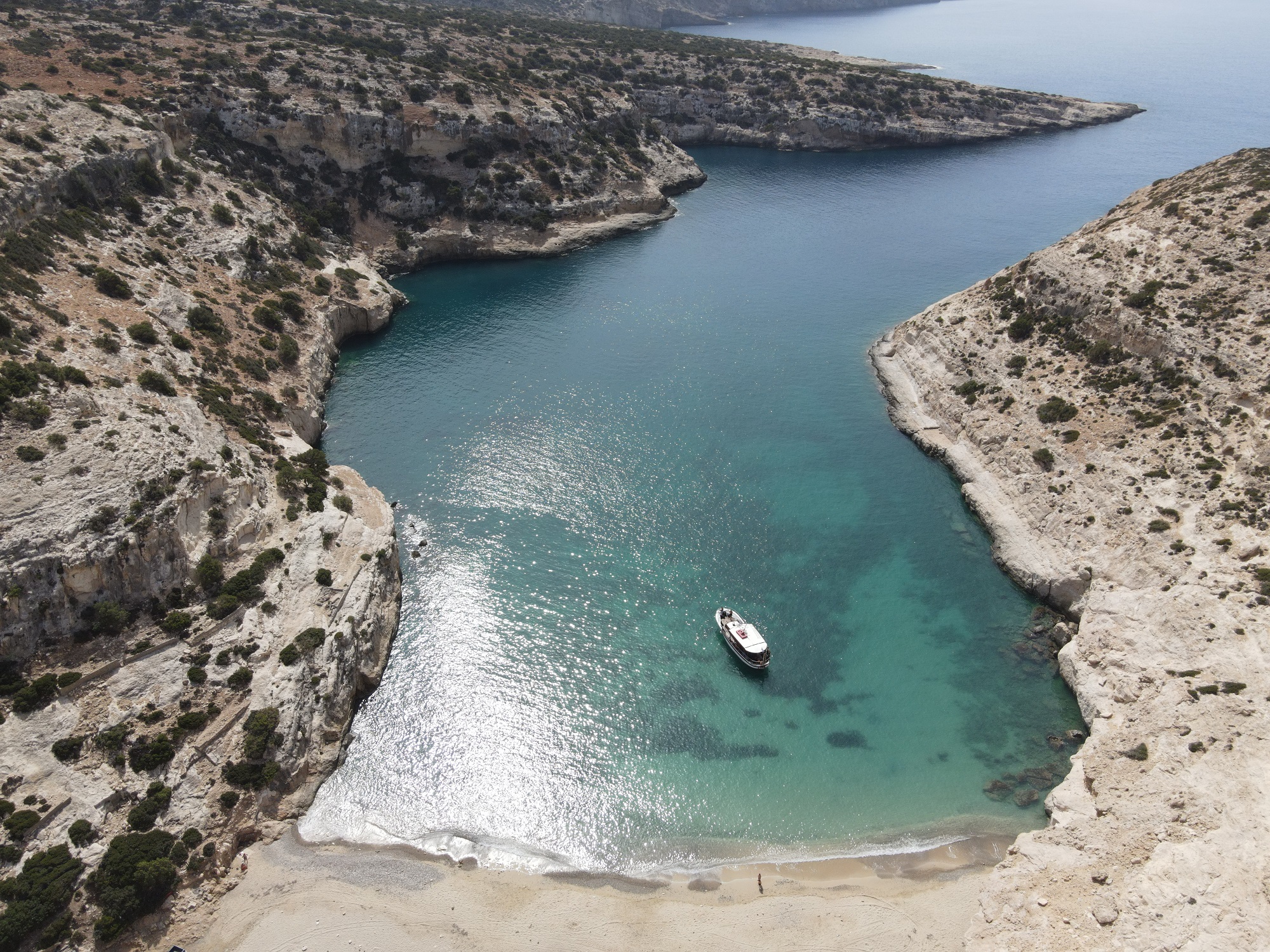 To reach Vathy by car, take the paved road from Sivas village to the Odigitria Monastery. From there, follow the right dirt track westward toward Kefali Mount, crossing the rugged Cape Lithino. Continue along the challenging gravel road for about 15 km, guided by signs. Alternatively, if you find yourself in the village of Matala, consider renting a boat for a picturesque arrival at Vathy. Upon entering the cove, a warm, welcoming feeling will instantly embrace you.